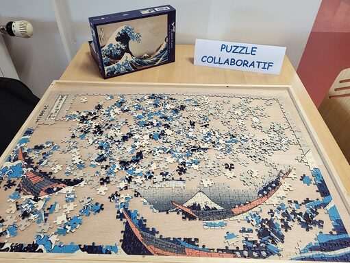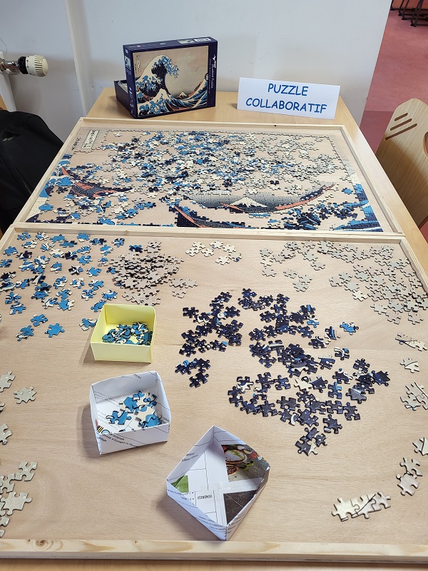 PUZZLE COLLABORATIF : il s’agit de réaliser un puzzle de 1000 pièces, à plusieurs. Chacun peut participer à sa construction en observant et en respectant ce qui a été fait avant.